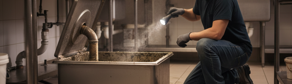 Bad odors near drains or throughout the kitchen often point to trapped FOG and bacterial growth. If drains run slowly or sinks empty sluggishly, that can indicate partial blockages. Grease backing up into sinks or floor drains is a sign solids are surfacing and the risk is urgent.